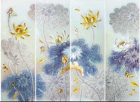 淡雅的百合、傲放的梅花、璀璨的桃花……現(xiàn)代浪漫型藝術(shù)玻璃多采用夾膠工藝制作,也有部門是在中間夾上碎玻璃,玻璃的內(nèi)面采用淺雕工藝雕刻花朵圖案,由雙層與三層玻璃制成,玻璃表面采用如水波浪的凹凸紋裝飾,再結(jié)合噴砂工藝,在花朵圖案上面灑上閃閃發(fā)光的微晶粉,從而營(yíng)造出清新淡雅浪漫旖旎的迷離風(fēng)光。